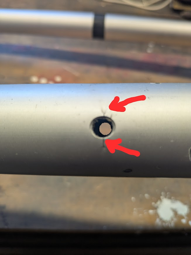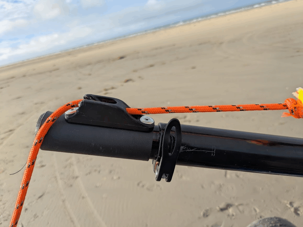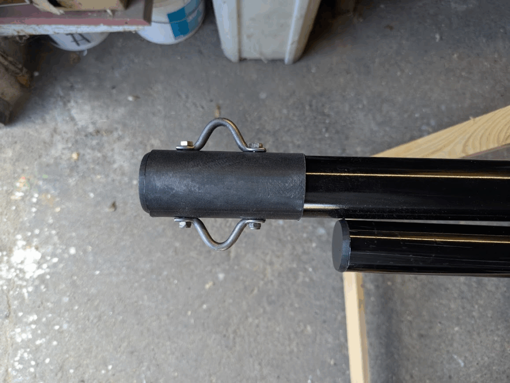 Inden rørene skubbes ind i hinanden, monteres en klemme på det lille rør, som dem til saddelpinde på cykler. Den skal holde det lille rør i den længde jeg har brug for. Efter afprøvning i op til 14ms virker systemet perfekt. Jeg kan dog nok gå ned i materiale tykkelse til måske 2 mm., da jeg ikke borer huller i rørene.